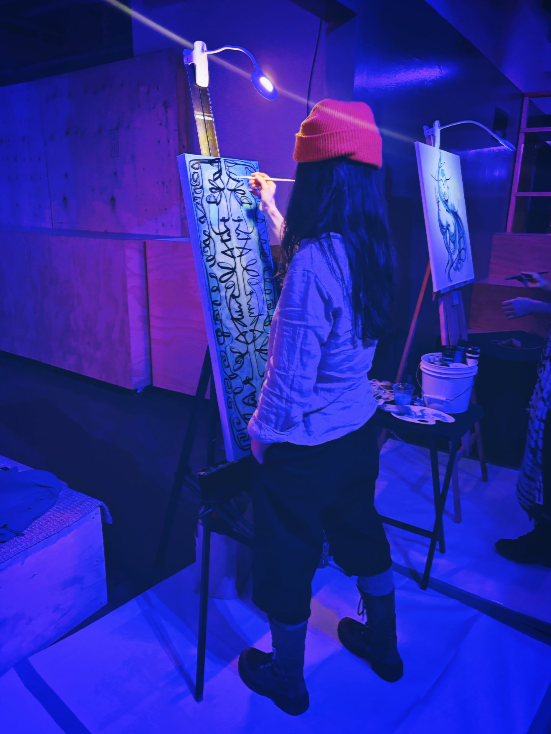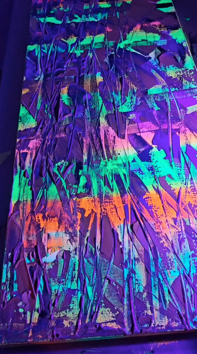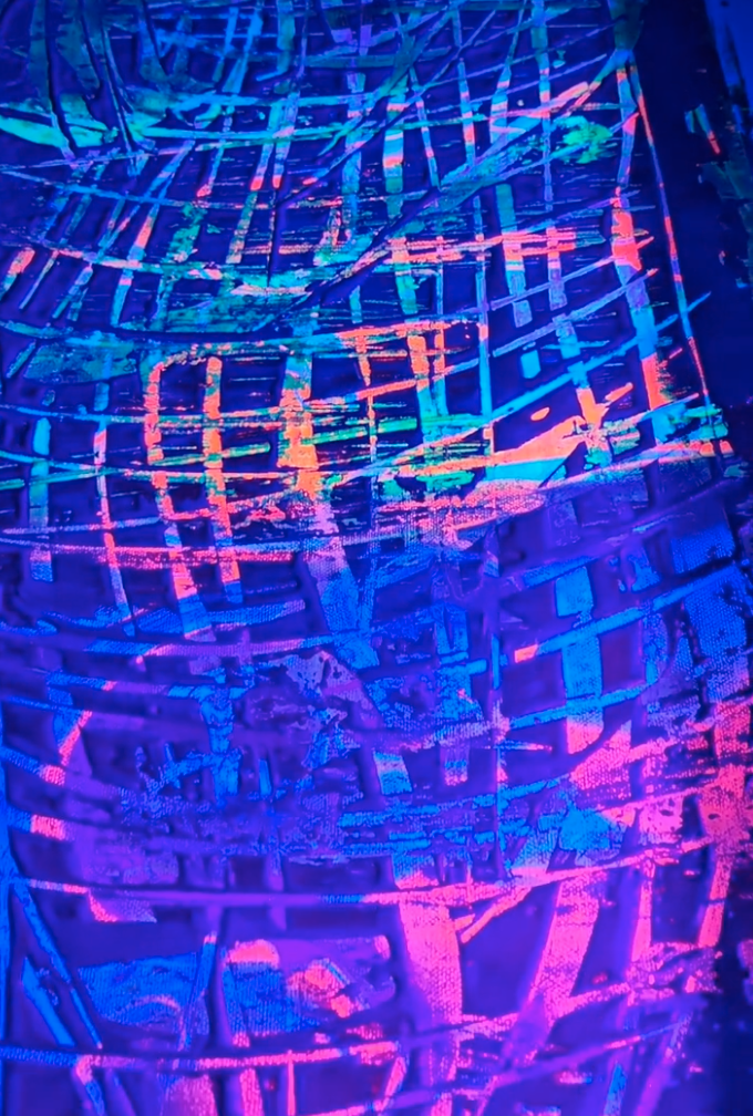 The collection is an immersive, double-sided abstract works in multiple size ranges, created to transition through three color states and transform into glowing forms under blacklight.